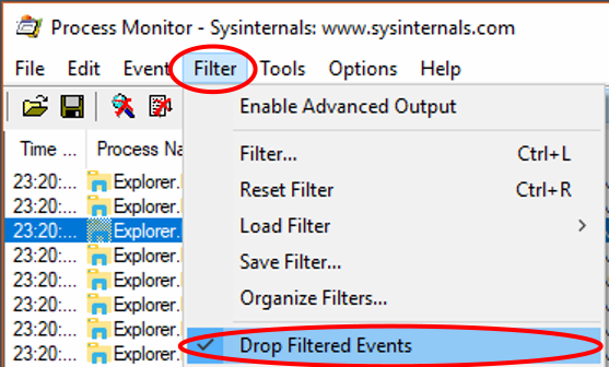 By default, events that are filtered are still kept track of. Meaning if you were to clear the filters you would see the events again. However since Process Monitor excels at collecting absurd amounts of data, it can quickly bog down your system. To deal with this, if you select the Filter menu, and then Drop Filtered Events, Process Monitor will just drop (as opposed to hide) the events that get excluded by the filters.