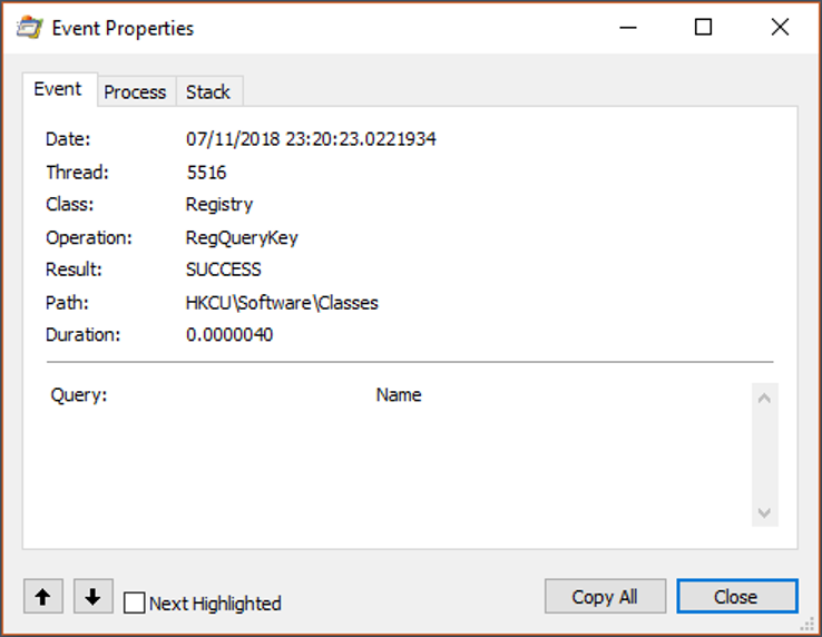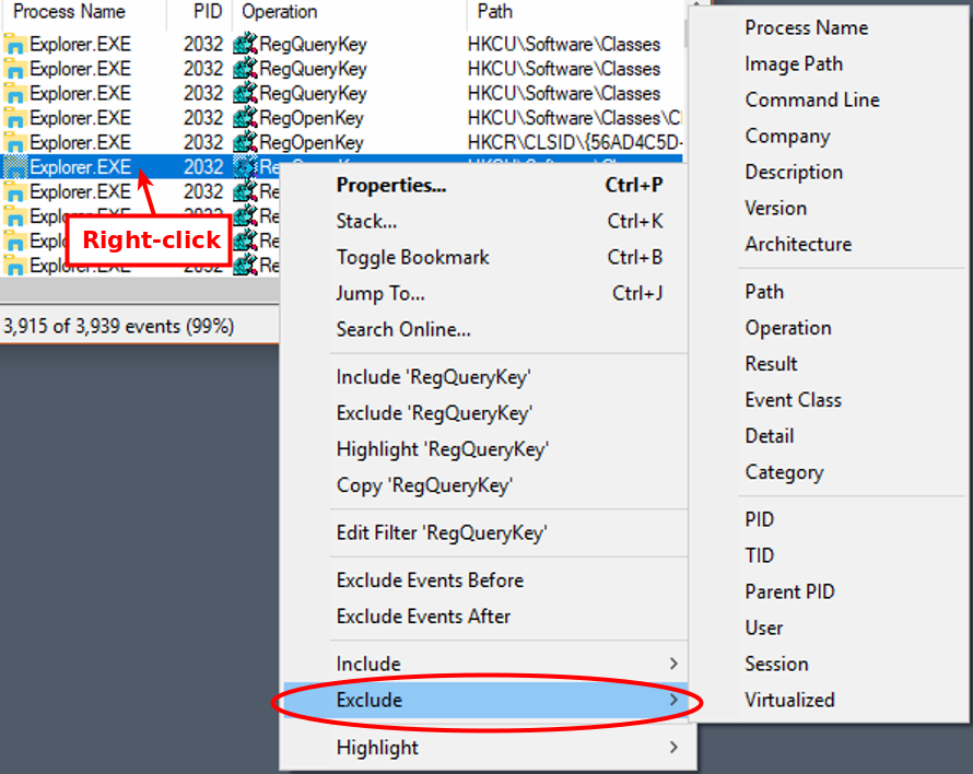 The other major way to filter events is to use Process Monitor filters. These are an effective way to separate the noise you usually don't care about, from the things that will help you get your job done (like the events related to malware).