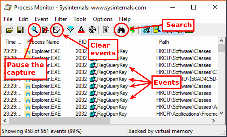 When you start Process Monitor, you will probably start seeing a lot of data accumulating really fast. To pause data collection, click on the magnifying glass icon, third in from the left or hit Ctrl+E. To clear the events in the events window click the eraser icon, fifth in from the left, or hit Ctrl+X.