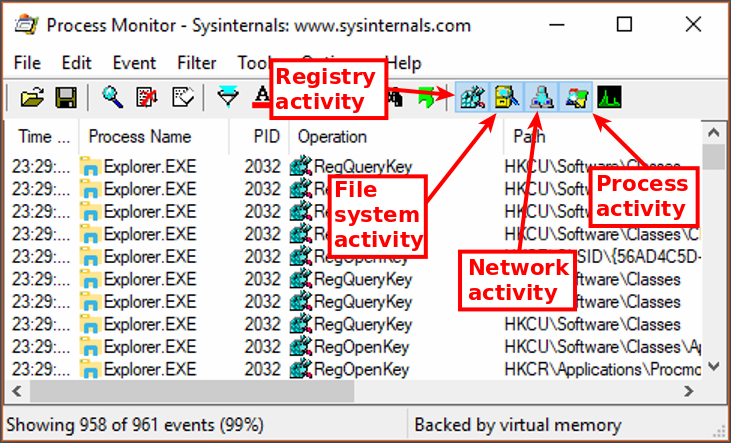 On the Process Monitor toolbar, you'll see four buttons that describe the categories of activity Process Monitor will display. The categories are (in order from left to right):